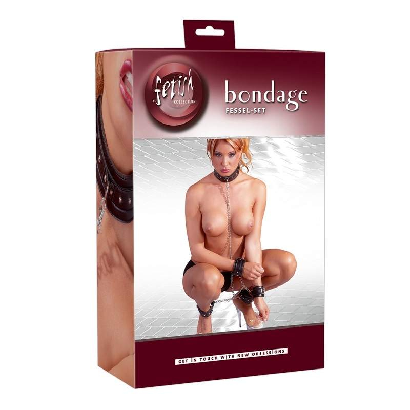 Комплект из ошейника, наручников и кандалов для ног, каждый шириной 5 см, регулируются при помощи застежек с пряжкой.