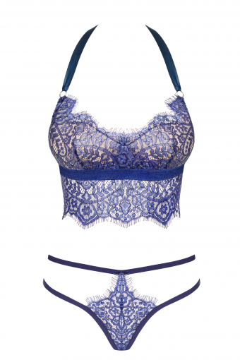 Замечательный оттенок синего заставит вас выглядеть немного легкомысленно и очень сексуально.Кружевная ткань с эффектом ресничек, атласная шнуровка вокруг шеи и трусики в виде стрелочки - без намеков объяснят ваши желания. В этом комплекте вы будите чувствовать себя потрясающе, чувства будут переполнять не только вас но и вашего партнера.