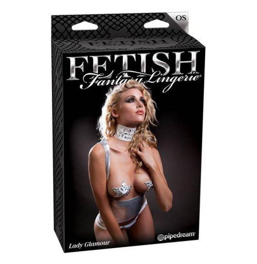 Серебристый наряд из топа с открытой грудью и трусиков-стринг придаст вашему образу звёздного сияния. Причём буквально, ведь ваш бюст будет прикрыт лишь двумя звёздочками с кристаллами. В костюме гламурной леди от вас так и будет веять сексуальностью. Мужчина, блуждая взглядом от шейки, украшенной ошейником, к треугольнику внизу живота, почувствует, как его распирает желание!