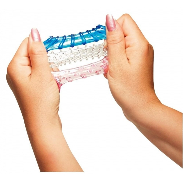 Комплект насадок на мужской половой орган из особо эластичного материала. В комплекте три штуки одинаковой длины, но разного, в силу разницы рельефа, диаметра. Пышные точки, мягкие ребра, ласковые шипы - три волнующих рельефа на выбор для невероятных ощущений!