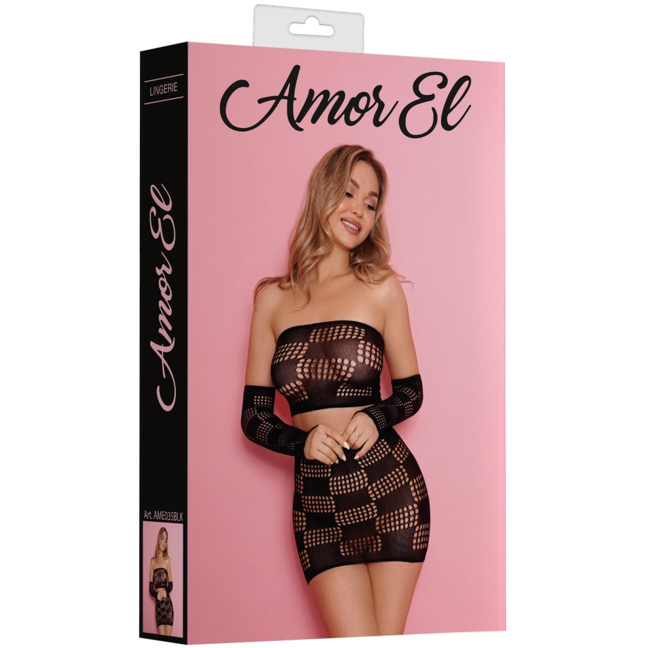 Комплект состоит из топа, мини юбки и митенок.