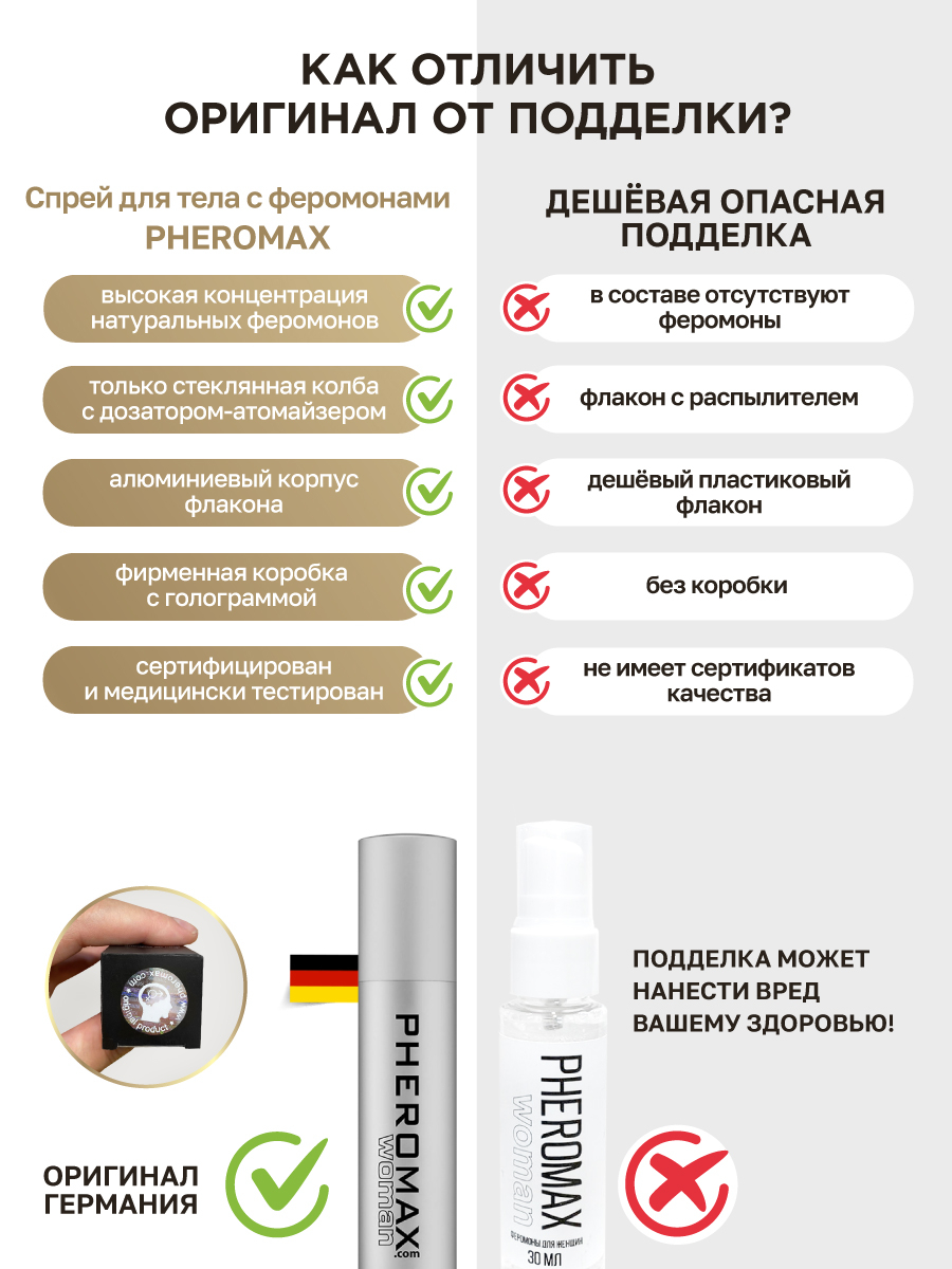 Будьте внимательны при покупке концентрата феромонов Pheromax, относитесь ответственно к своему бюджету и здоровью, покупайте только оригинальный продукт и вы будете вознаграждены неизменным положительным результатом.