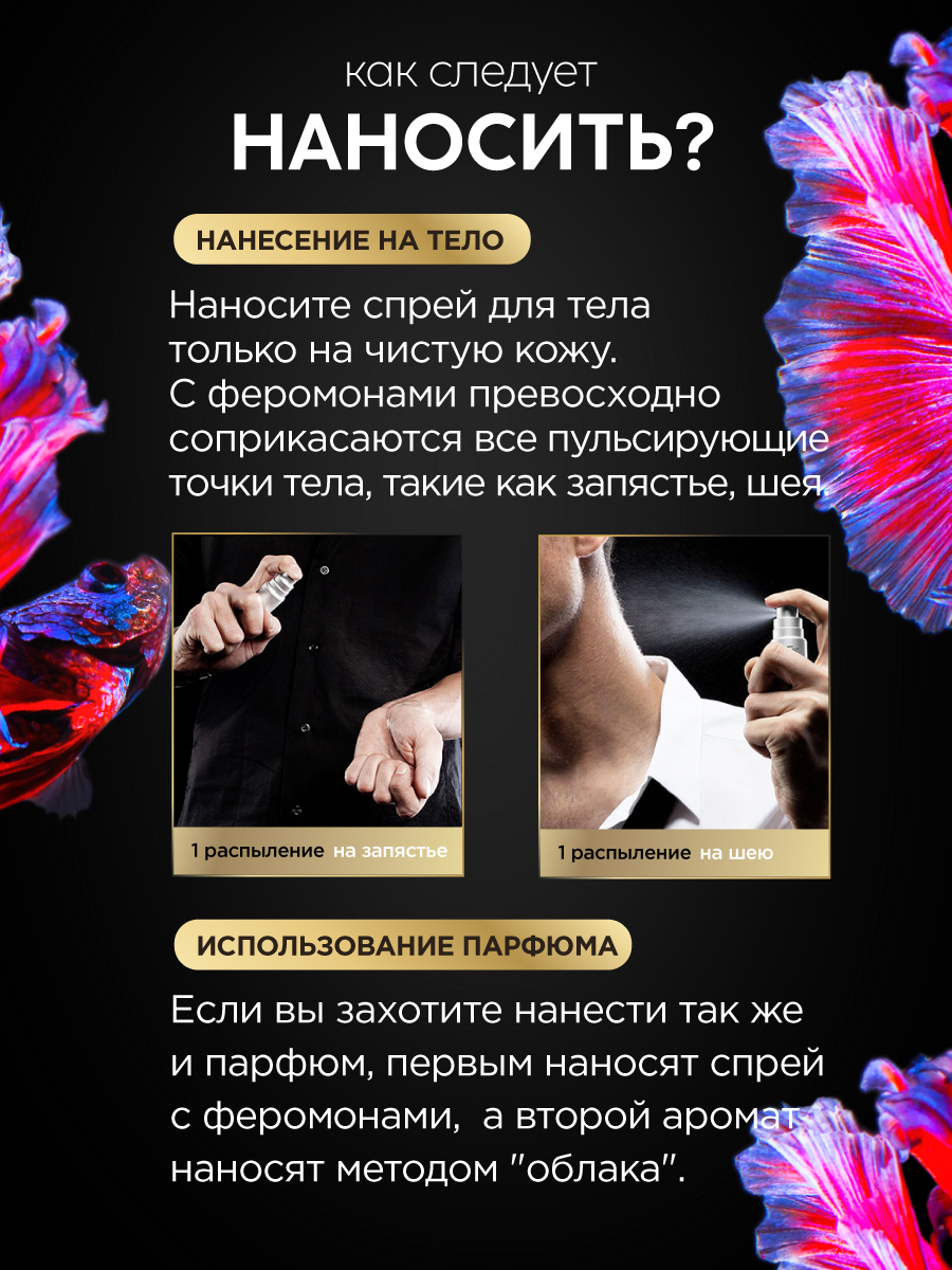Окситоцин, андростенол, копулин – это активные вещества феромонов. Они воспринимаются противоположным полом и вызывают сексуальное желание. Но спрей можно использовать не только так. Идете на деловую встречу и вам нужно подписать важный договор? Обязательно нанесите пару капель феромонов на область шеи или запястья!