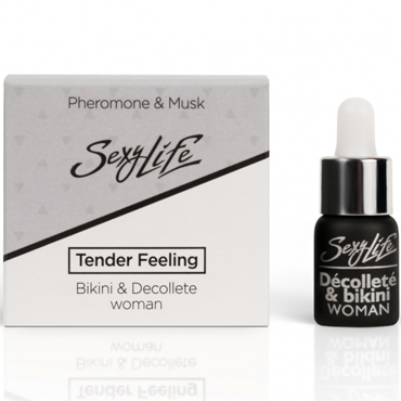 Sexy Life Tender Feeling Bikini & Decolette woman - уникальный продукт с высоким содержанием парфюмерной композиции и максимальной концентрацией феромонов, а также с добавлением мускуса, что делает духи пикантной изюминкой для завершения образа. Результатом использования окажется неуловимый штрих, который при более близких взаимоотношениях может стать решающим при принятии решения, а так же поможет усилить притягательность и придать больше страсти отношениям. Применение: нанести небольшое количество (1-2 капли) на область бикини и/или декольте.