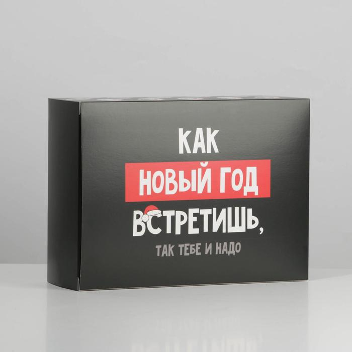 Коробка яркая запоминающаяся, но надпись на ней просто супер: Как новый год встретишь, так тебе и надо. Подарив свой подарок в такой коробке, вы берете на себя обязательство: сделать этот праздник незабываемым.