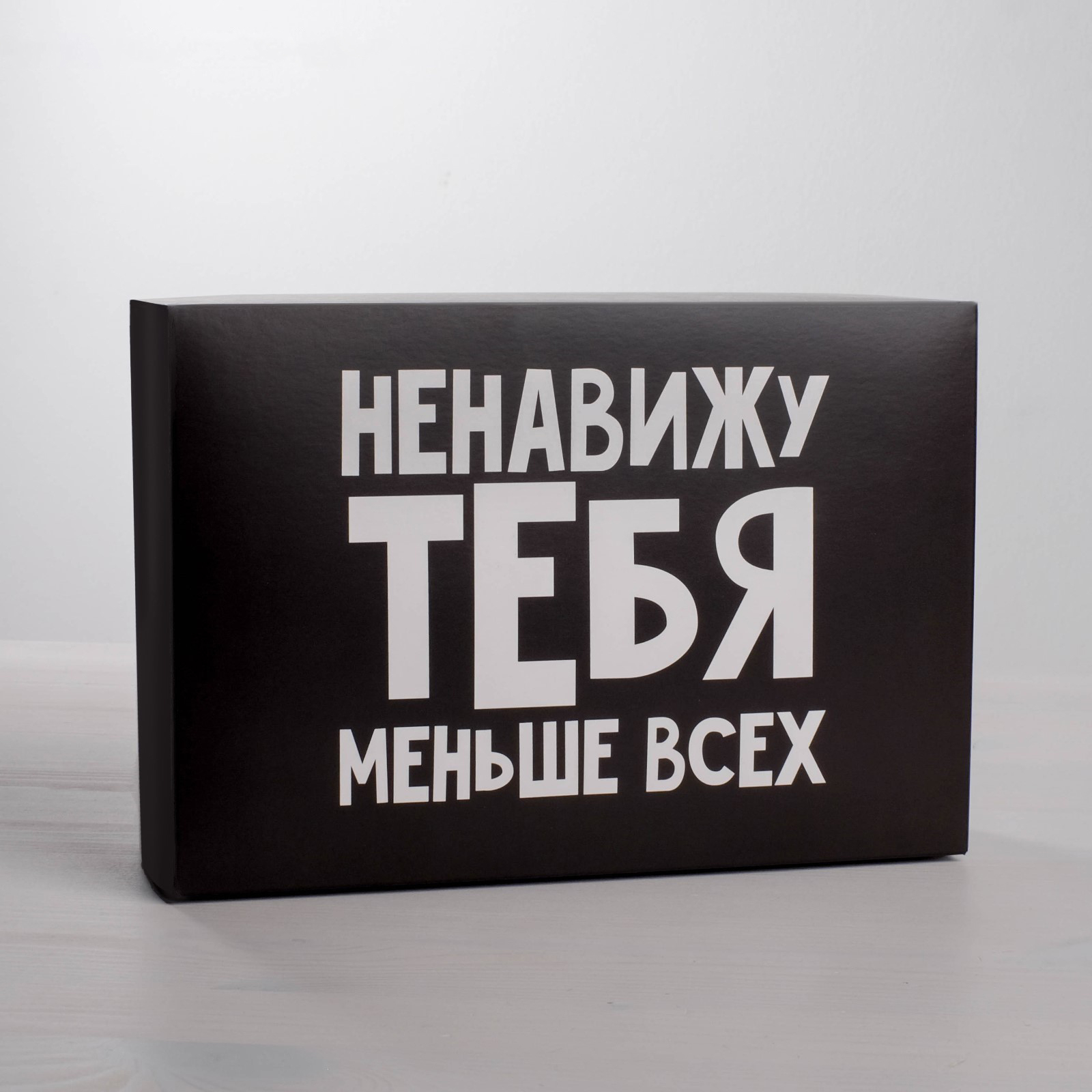 Картонная коробка в черном цвете с жизненной надписью.