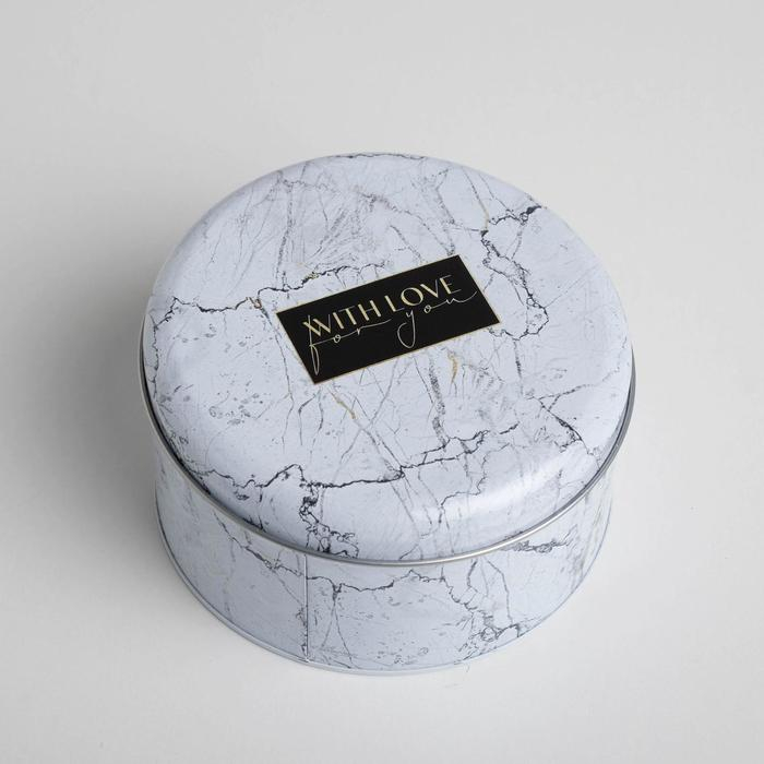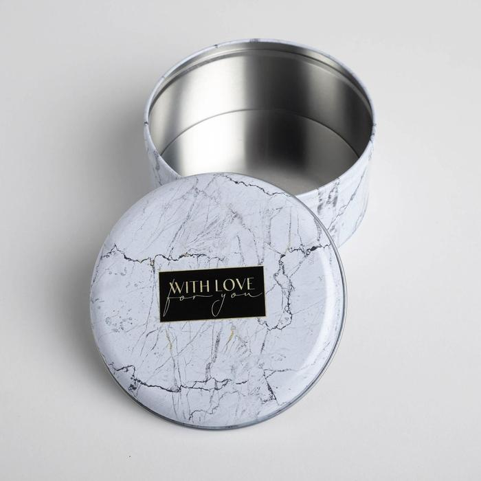 Жестяная коробка круглой формы, уже говорит о том, что вы желаете чтоб в жизни одаряемого было меньше болезненных углов. Слова "С любовью для тебя", говорят сами за себя.