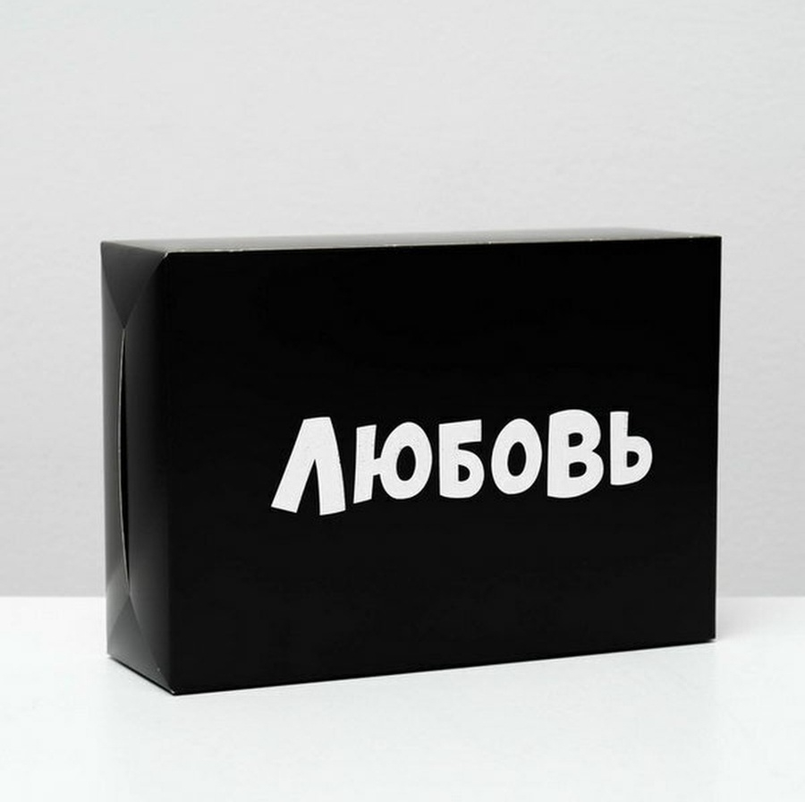 Черная непрозрачная коробка со словами любви может хранить разные секреты удовольствия, её так и хочется открыть, она привлекает внимание с первых моментов.