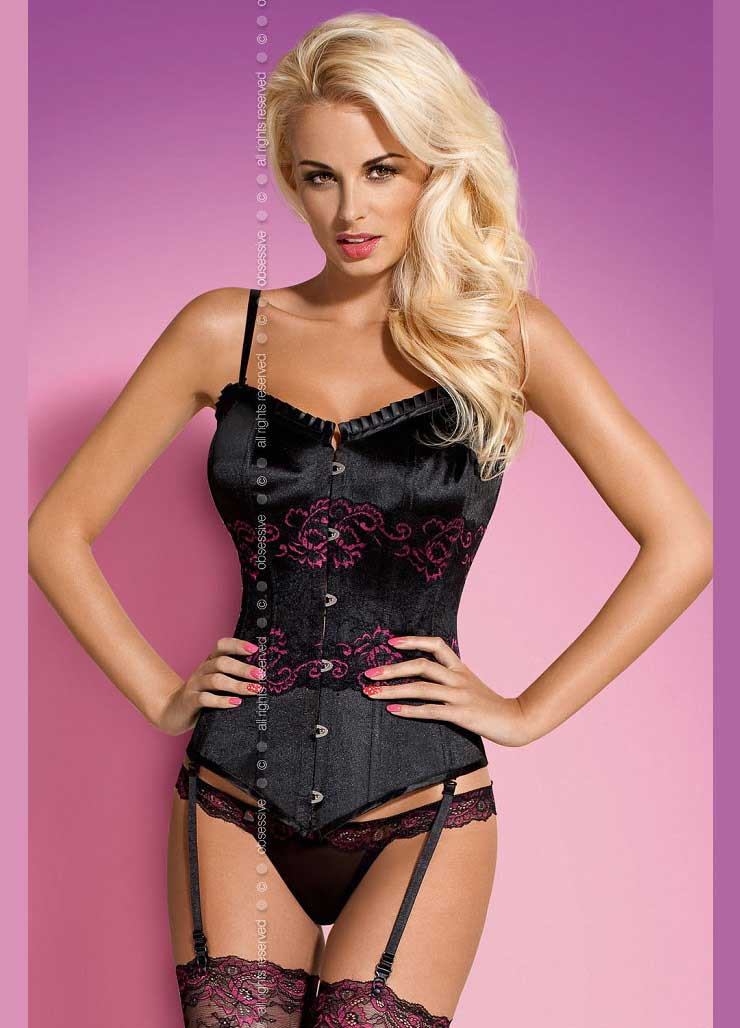 Очаровательный, черный, атласный корсет с вставками из кружева и цветочной вышивкой. Прекрасная отделка – атласная и нежные оборки в верхней части создают изысканный образ. Вертикальные кости по периметру и шнуровка сзади создают идеальную посадку по фигуре.