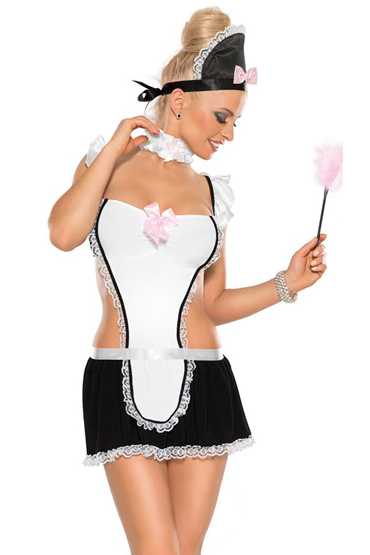 Костюм горничной из коллекции одежды для ролевых игр польского бренда Roxana. Коротенькое платье декорировано белой кружевной оборкой и розовым бантиком. Особый тон задают аксессуары – головной убор и повязка на шею. Ролевые игры сделают Ваши сексуальные отношения особыми, внесут в нее новые эмоции и ощущения. В этот раз Вы можете начать с небольшой уборки Вашей спальни, которая несомненно будет иметь страстное продолжение.
