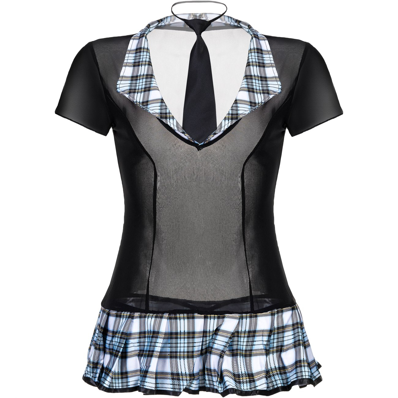 На первый вид строгий костюм, прям то, что и надо, голубая клетка и галстук. Но заметьте мини платье выполнено из прозрачной сетки и совершенно не прикравает ваши самые аппетитные места. Зажигайте не на шутку, ведь завтра каникулы.