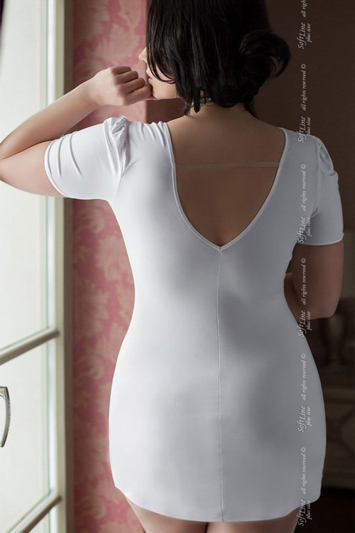 Белое облегающее платье подчеркивает все достоинства фигуры. Глубокий вырез на груди не оставит равнодушным ни одного ''пациента''.