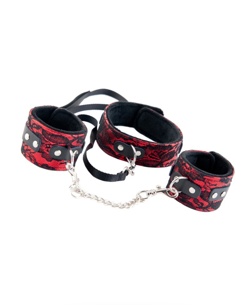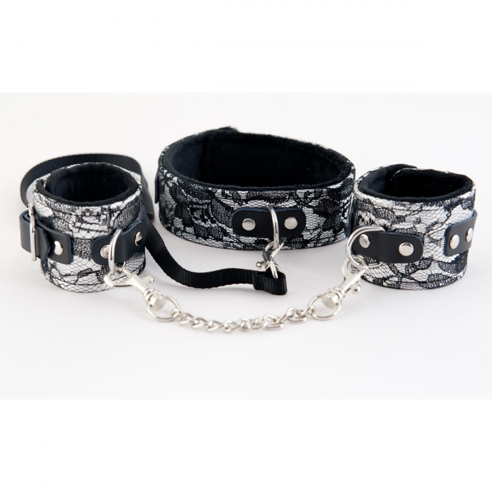 Этот кружевной набор является отличным инструментом для бандажа. Да, он не похож на привычные аксессуары для ограничения свободы движений. Он отличается особенной изысканностью. В таком комплекте любая женщина чувствует себя роскошно, даже находясь в покорном подчинении. В набор входят ошейник и наручники, которые можно использовать в качестве отдельных атрибутов.