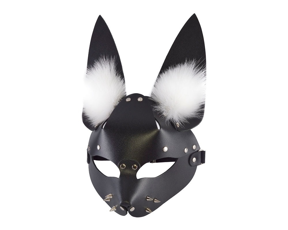 Вроде бы персонаж зайки должен быть нежным и пушистым, но только не эта зайка. Маска выполнена из натуральной черной кожи прекрасного качества. Ушки подбелены пушистым натуральным мехом, смотрится бесподобно- правда. Но и это ещё не все так как маска декорирована хромированными клепками и шипами - это уже зайка- госпожа, чувствую она может серьезно наказать и показать характер. Эта хитрая мордашка знает чего хочет!!!