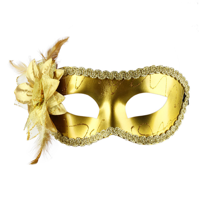 Маска из пластика золотистого цвета, декорирована тесьмой, цветком и перьями. Завязывается на ленты.