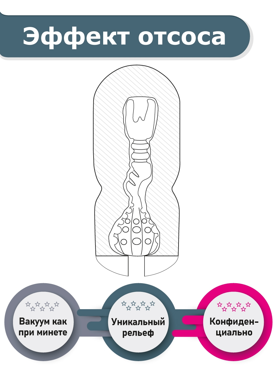 Внутренний рукав наполнен многофункциональными выпуклостями и уникальным рельефом. Начинается все с узкой дырочки, которая предвещает настоящий бум страсти. Затем твоего "дружка" встречает отсек с ребристым и круглым рельефом. А затем самое интересное! Узкий длинный тоннель, который закручивается и сливается воедино с твоим телом, тебе буквально придется проталкивать член по этому ребристому каналу. Рельеф выполнен таким образом, чтобы стимулировать не только основной ствол члена. Ты сможешь ласкать уздечку полового члена, или даже головку!