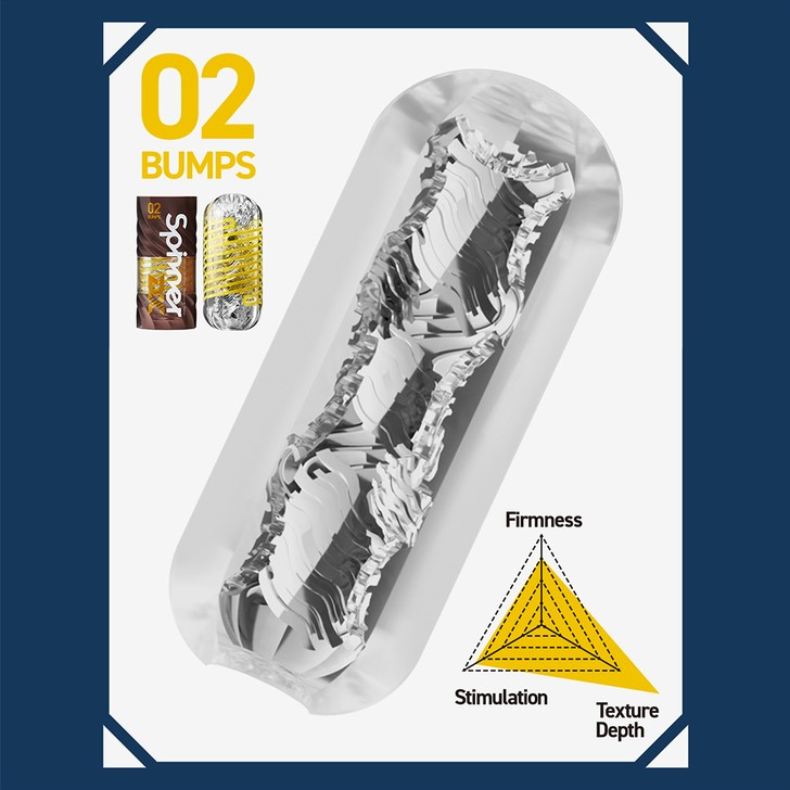 Внутри вас ждет бархатистая мягкая текстура, гарантирующая наслаждение уже с первых секунд использования. Bumps отличается волнообразным рельефом - здесь чередуются плавные выступы и мягкие гребни, создающие эффект интенсивных катящихся волн на каждом миллиметре. Они плотно обхватывают, усиливают прилегание, дарят точечную стимуляцию, которая понравится тем, кто любит более плотное сжатие и богатую комбинацию ощущений давления и скольжения. Этот спиннер идеален для мощной, насыщенной стимуляции, но при этом ощущается мягче, чем Steps, но насыщеннее, чем Drops.