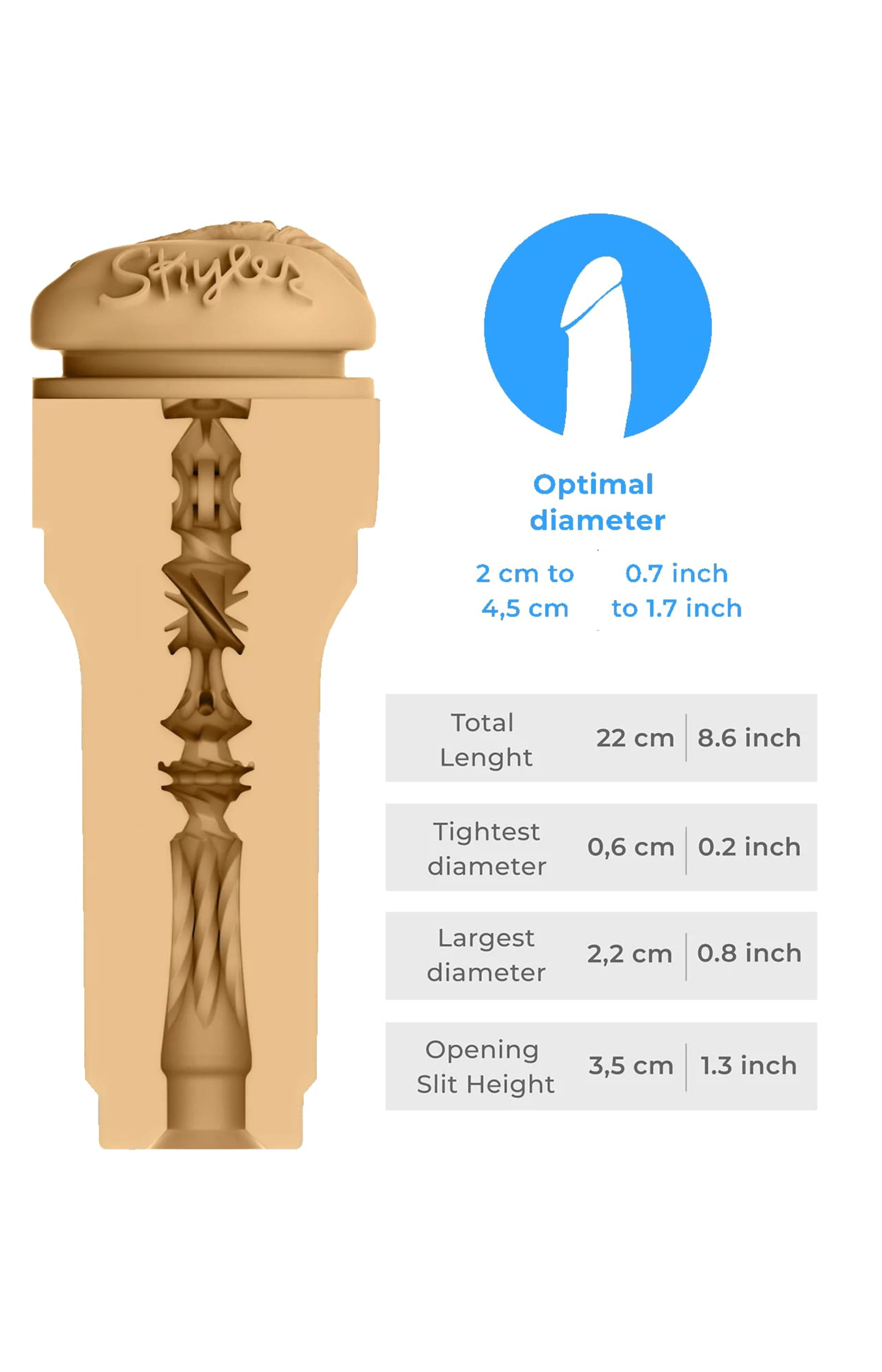 Обхватывающий узкий вход FeelSkyler мгновенно захватывает и стимулирует, увлекая вас в мир ромбовидных и звездообразных выступов, создавая непревзойденное сочетание ощущений. Два кольца в конце туннеля обеспечивают максимальную награду, захватывая и массируя длину и кончик вашего пениса для интенсивной стимуляции, прежде чем вы перейдете к еще более плотным изгибам.
