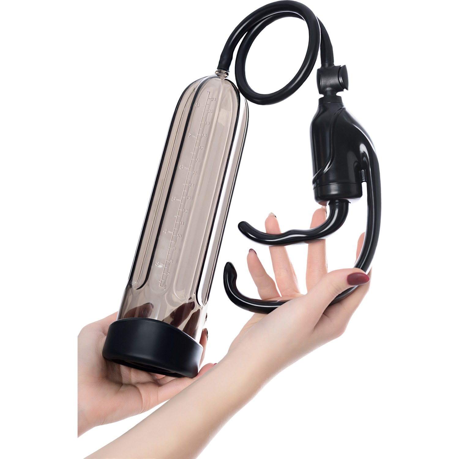Стильная обтекаемая колба как шикарный болид, выполнена из высококачественного пластика, с нанесенной линейкой, чтобы наблюдать за результатами. Колба имеет рельеф, для того, чтобы её было удобно держать в руках. Плотная силиконовая насадка идет в комплекте, благодаря ей насадка обеспечивает вакуум и плотное прилегание. Эластичный плотный силиконовый шланг с клапаном для сброса давлений и эргономичный ручной насос с удобным захватом, очень мощный.