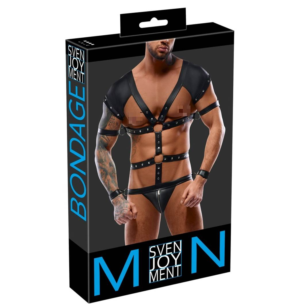 Боди с 4 кандалами в наборе от Svenjoyment BONDAGE. Стильный черный матовый костюм с заклепками и ремешком под мышку. Регулируемый нагрудный и поясной ремень (на кнопках). Застежка–молния с подкладкой в сумке - пофри (джок). На поясном и нагрудном ремнях по бокам с кольцами, через которые можно продеть прилагаемые ремни. Регулируемые застежки-липучки позволяют быстро застегивать застежки-молнии для приятной фиксации.