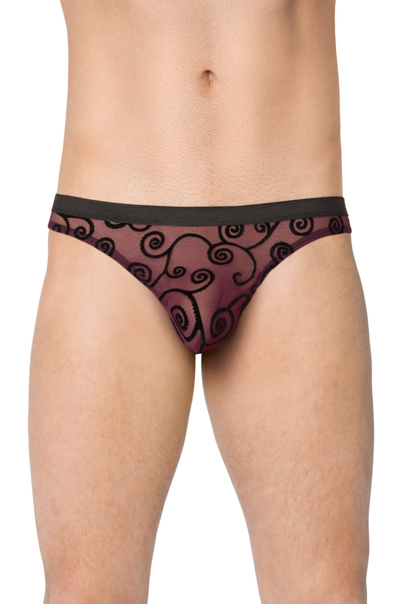 Полупрозрачные сетчатые мужские стринги выполненные в бордово-фиолетовом цвете с красивым бархатным черным орнаментом в виде завитушек. Эти стринги будут смотреться очень необычно и сексуально на мужчине, выделяя его мужское достоинство. Внимание вам гарантировано.