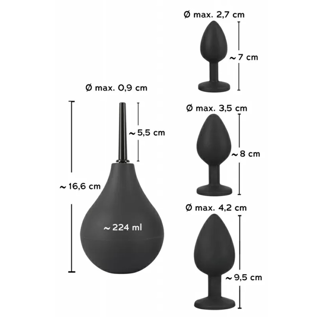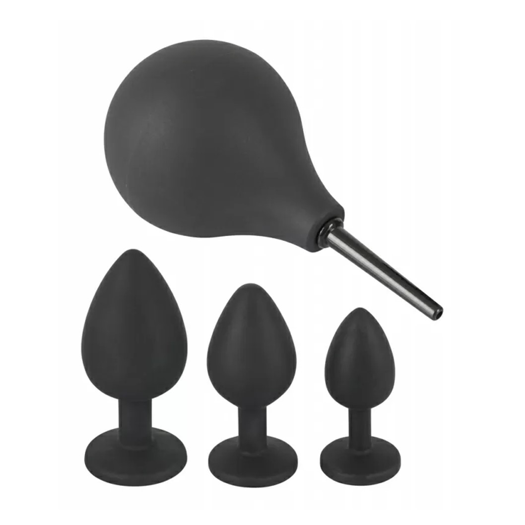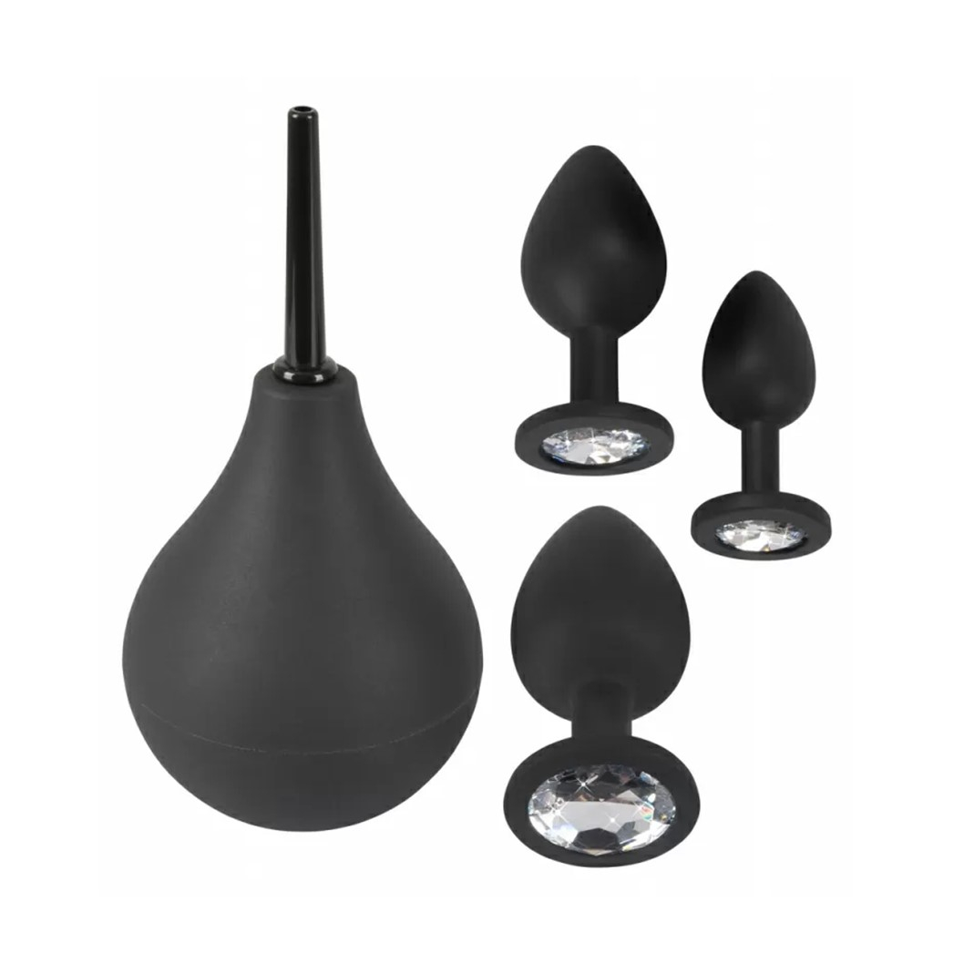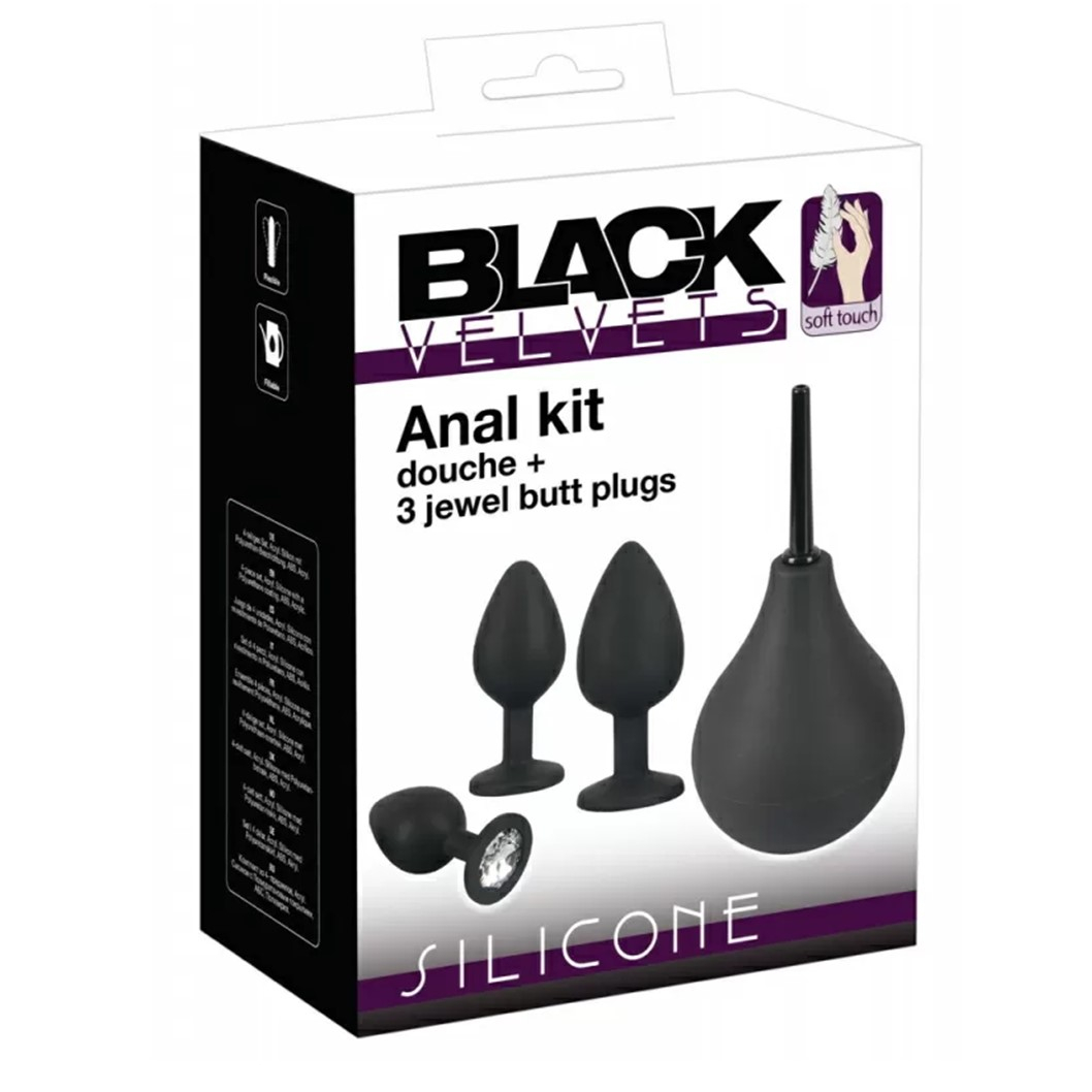 Black Velvets Anal Kit - отличный набор для любителей и ценителей анальной стимуляции. В наборе 3 качественные пробочки разного размера, украшенные крупными кристаллами, а также удобный интимный душ для очищения интимной зоны.