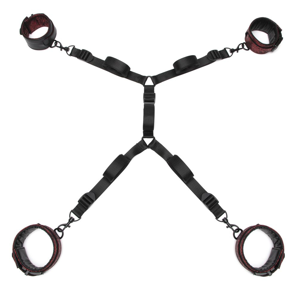 Фиксаторы состоят из стильных манжетов, которые легко регулировать в диаметре. Они приятны к коже, мягкие и комфортные, но при этом и прочные, надежно ограничат движения рук и ног. Между собой фиксаторы соединяются длинными ремнями, которые можно пропустить под кроватью или матрасом. Таким образом, Ваш партнер (или Вы) будет распластан на кровати без возможности даже немного пошевелиться.