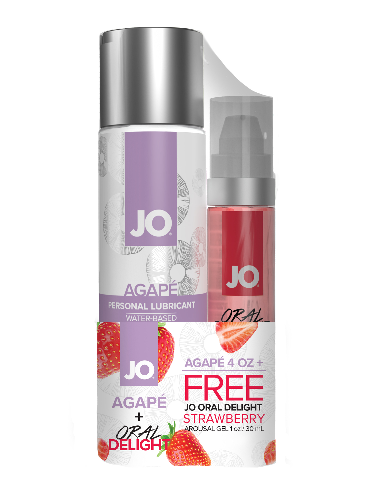 Набор лубрикантов, состоящий из лёгкого гипоаллергенного лубриканта на водной основе JO AGAPE LUBRICANT ORIGINAL, 120 мл и стимулирующего геля для оральных ласк с десенсибилизацией Oral Delight Strawberry Sensation (30 мл.)