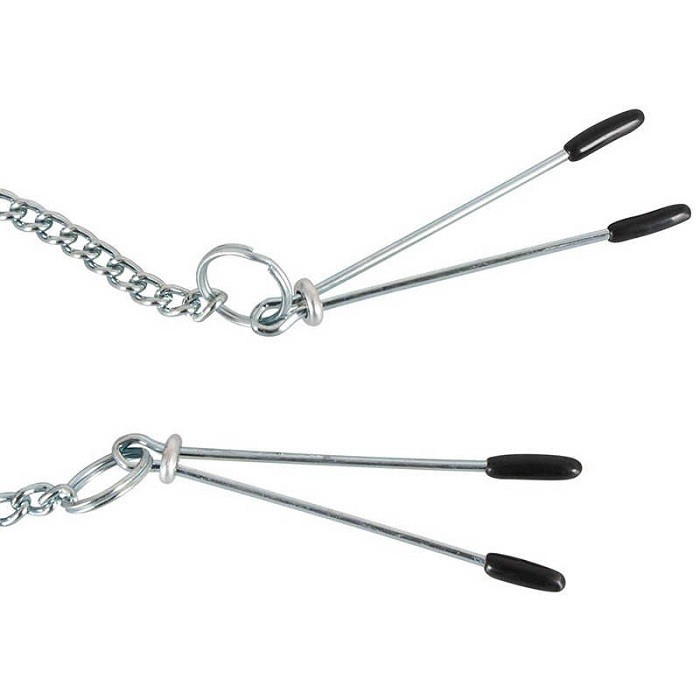 Вниз от девайса спускаются две серебристые цепочки с зажимами для сосков, которые регулируются натяжными кольцами и идеально подходят для начинающих пользователей. Кончики зажимов обернуты полиуретаном во избежание травмирования нежной кожи.