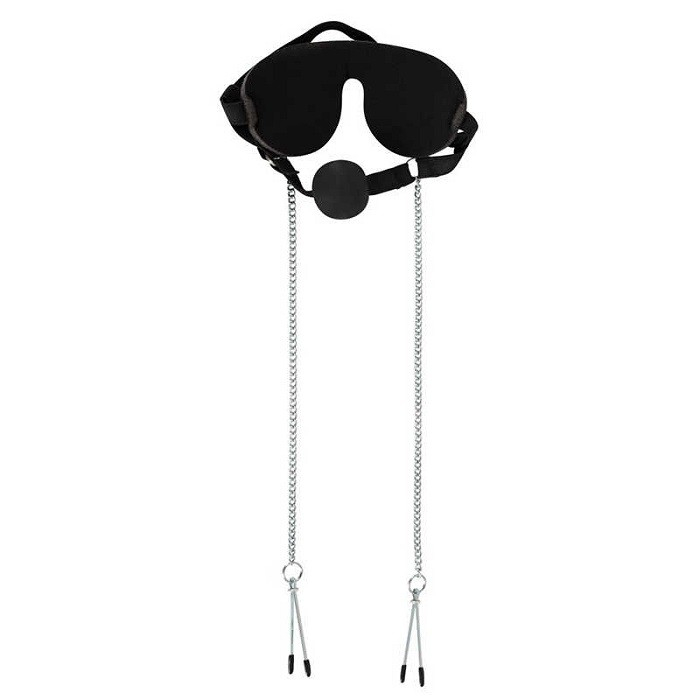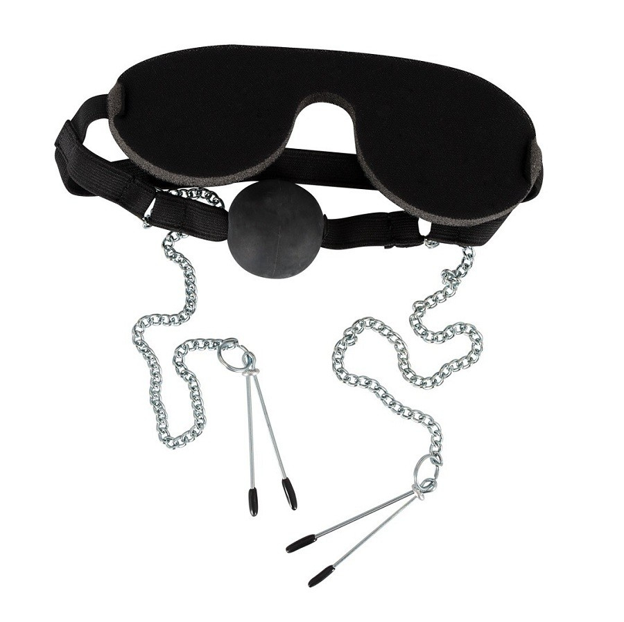 Непроницаемая маска на эластичной ленте соединена с кляпом-шаром из термопластичного эластомера, устойчивого к воздействию слюны и зубов.