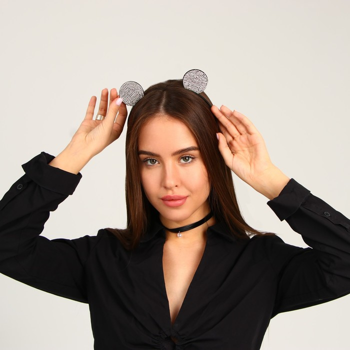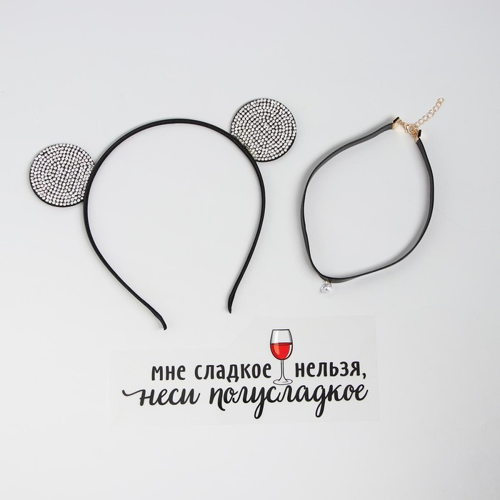 В наборе: ободок в виде ушек декорирован стразами, тоненький бархатный чокер с бусиной и термонаклека.