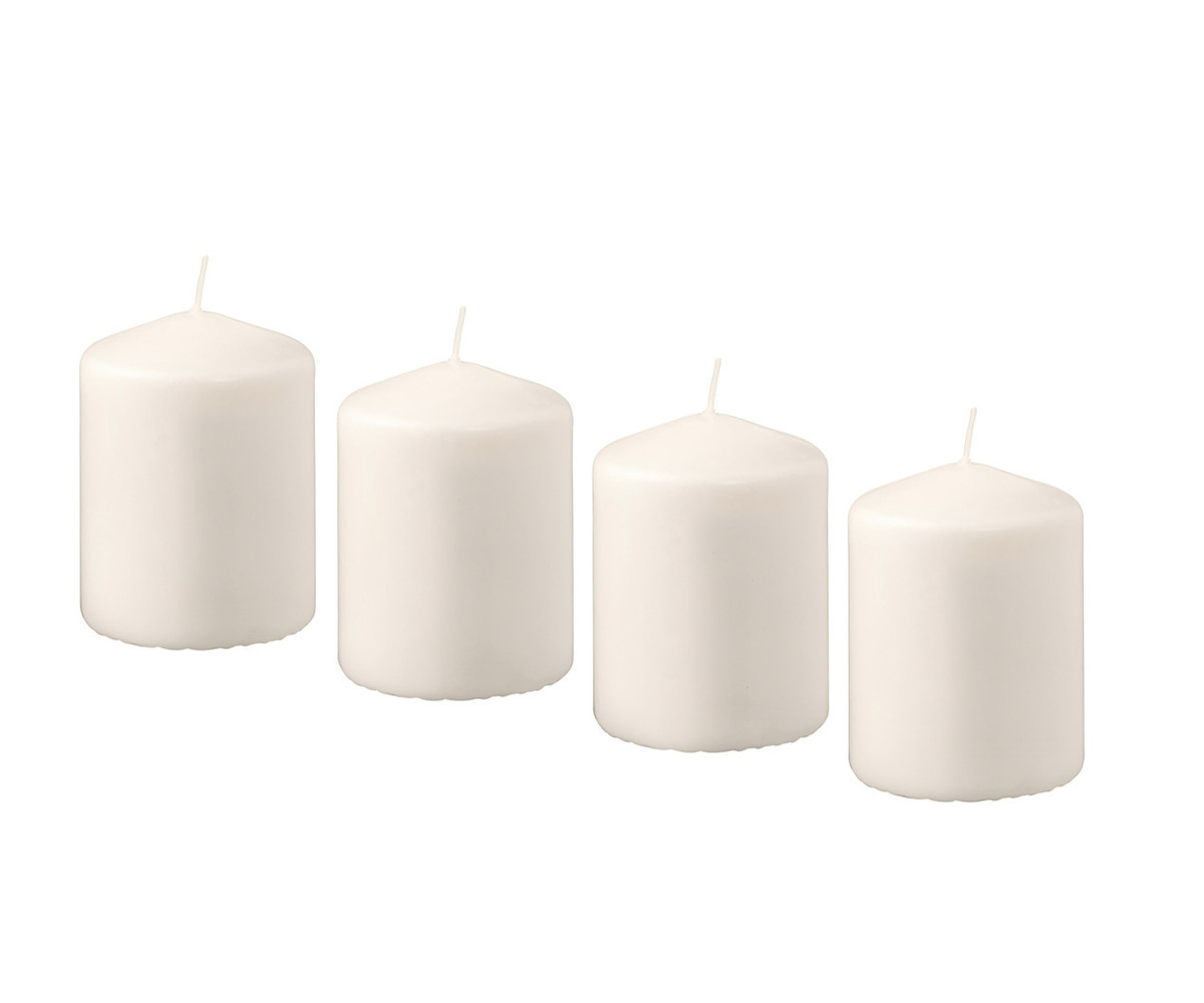 Набор из 4 пеньковых белых свечей столбиков, высотой 5 см, диаметром 4 см и временем горения 7 часов.