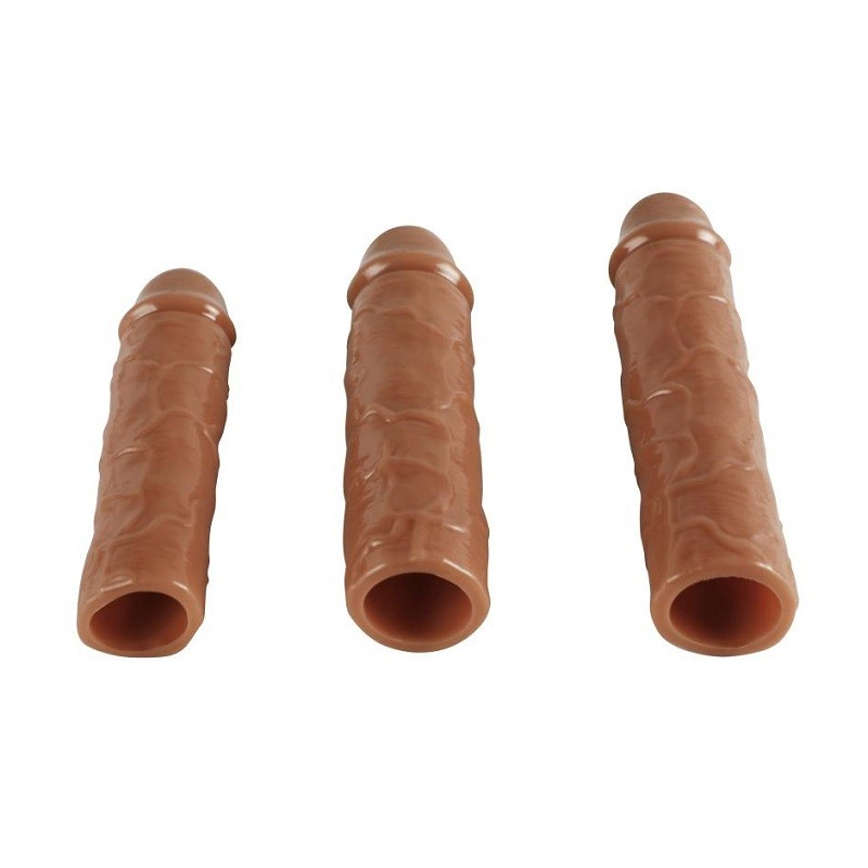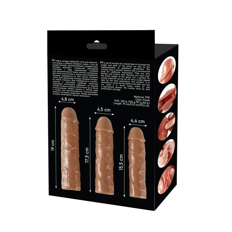 Набор из трех насадок REAL подходит для увеличения длины и обхвата полового члена, а так же осуществляет дополнительную стимуляцию при проникновении. Вы сразу получаете три насадки разной длины для разнообразия. Согласитесь, это очень удобно, ведь с природой не поспоришь, и поэтому если вы жаждете поэкспериментировать с длиной и обхватом- этот наборчик как раз исполнит все ваши фантазии.
