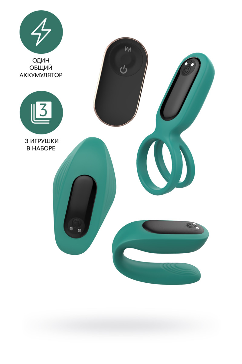 Эрекционное кольцо, вкладыш в трусики и вибратор-прищепка для одновременной стимуляции. Все три девайса, работают от съемного аккумулятора-вибратора и управляются с помощью пульта. Функционал вибромотора включает 8 режимов вибрации и магнитную USB зарядку. Игрушки выполнены из качественного шелковистого силикона насыщенного изумрудно-зеленого цвета. Для комфортного использования рекомендуется использовать с лубрикантом на водной основе.