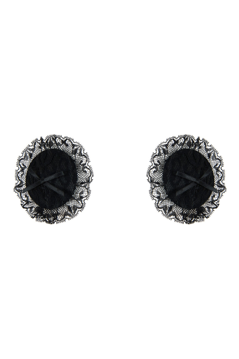 Наклейки на соски (пэстис) круглые, черного цвета, декорированы тонким нежным кружевом и миниатюрными черными бантиками. Наклейки многоразовые, изнутри пэстис пропитаны силиконовым гелем.