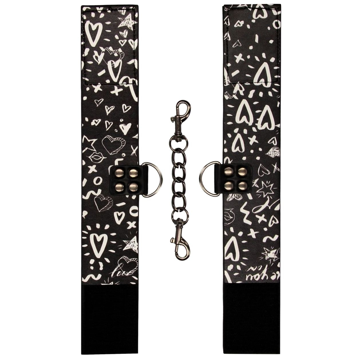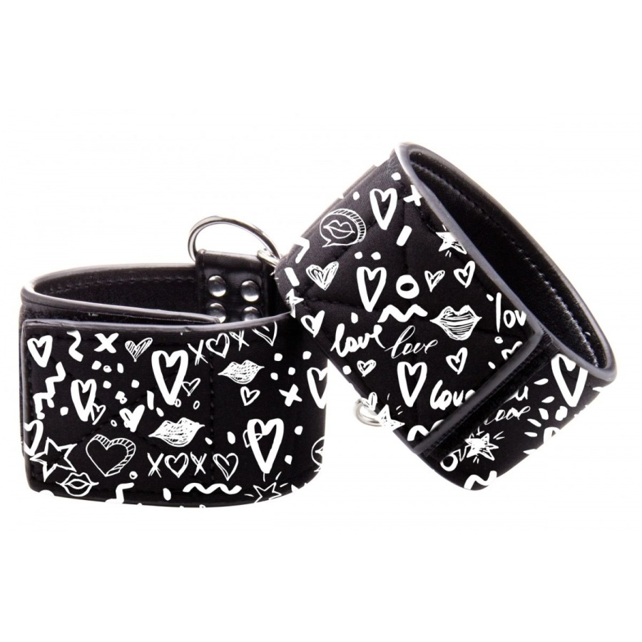 Оковы оформлены с применением изображений в стиле «стрит-арт». Белые значки, будто бы нарисованные от руки, покрывают черную кожу браслетов, создавая эффектный молодежный дизайн.