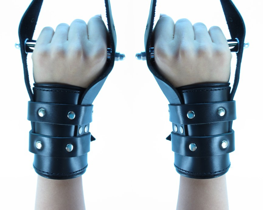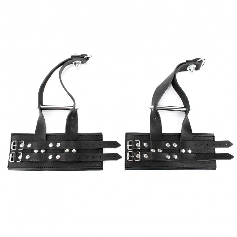 Наручники для подвешивания выполнены из толстой нежной кожи черного цвета с регулируемыми ремешками.