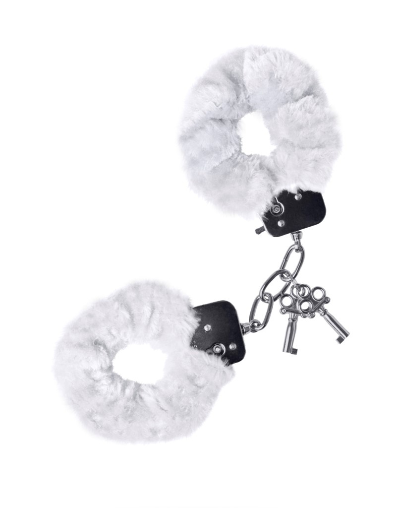 Наручники с металлическим основанием, декорированные белым искусственным мехом. С 2 ключами в комплекте. Регулируемый механизм позволяет сковывать как женские, так и мужские руки. На случай утери ключей или необходимости быстрого освобождения, предусмотрен рычажок быстрого открытия.