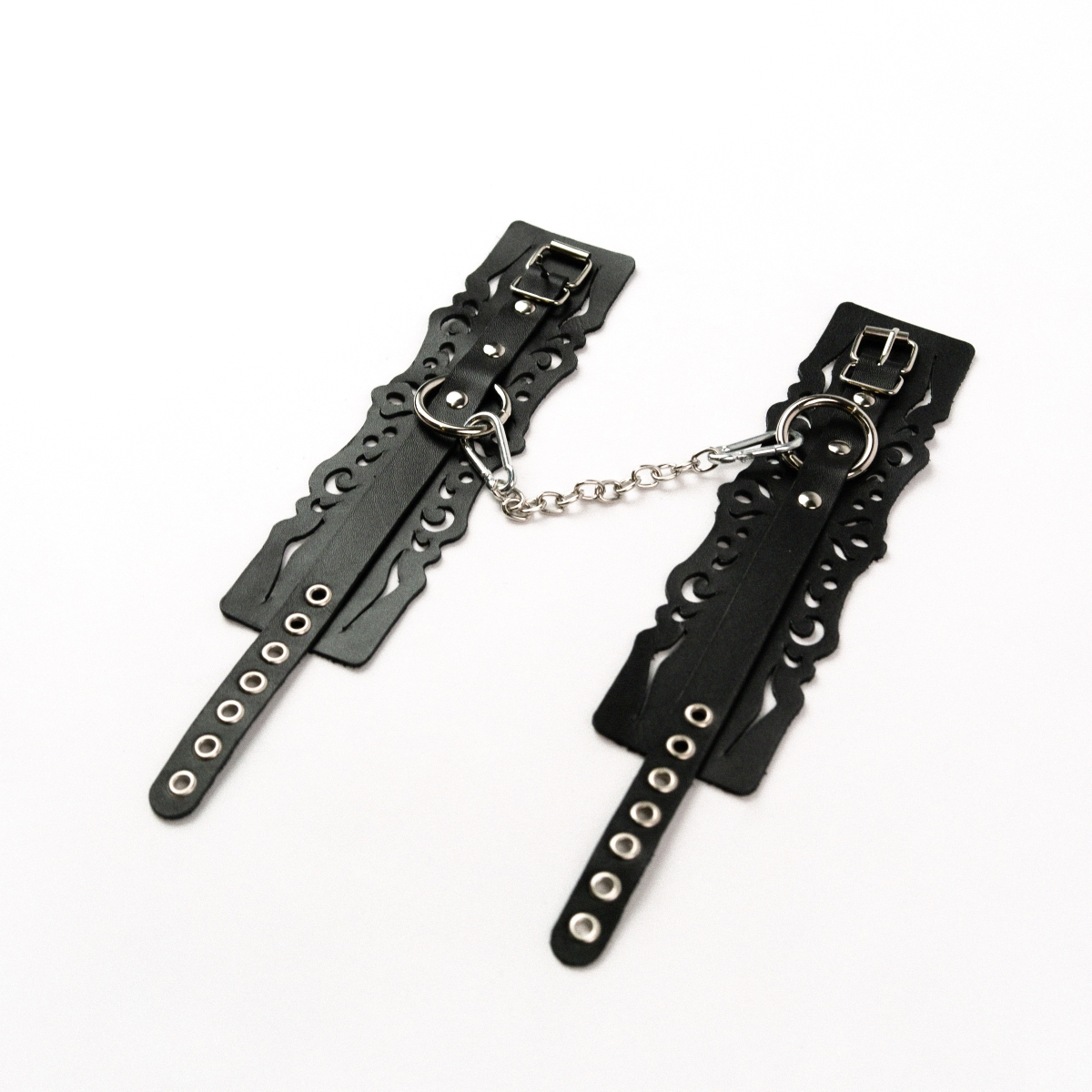 Мягкие, черные, ажурные, кожаные наручники-оковы могут стать стильным аксессуаром, а могут послужить вашим целям по своему прямому назначению. Частичное обездвиживание и невозможность двигать руками или ногами дают вам полную власть над партнером – взрослые игры для взрослых. Наличие двух колец и карабинов, соединенных между собой металлической цепочкой, позволяет использовать изделие как раздельно – аксессуар-манжеты, так и как наручники-оковы для фиксации. К широким металлическим кольцам также можно присоединить и другие аксессуары при помощи карабинов. Благодаря универсальному размеру наручники могут использоваться и мужчинами, и женщинами. Размер легко регулируется с помощью металлических пряжек, органично вписывающихся в общий стиль.