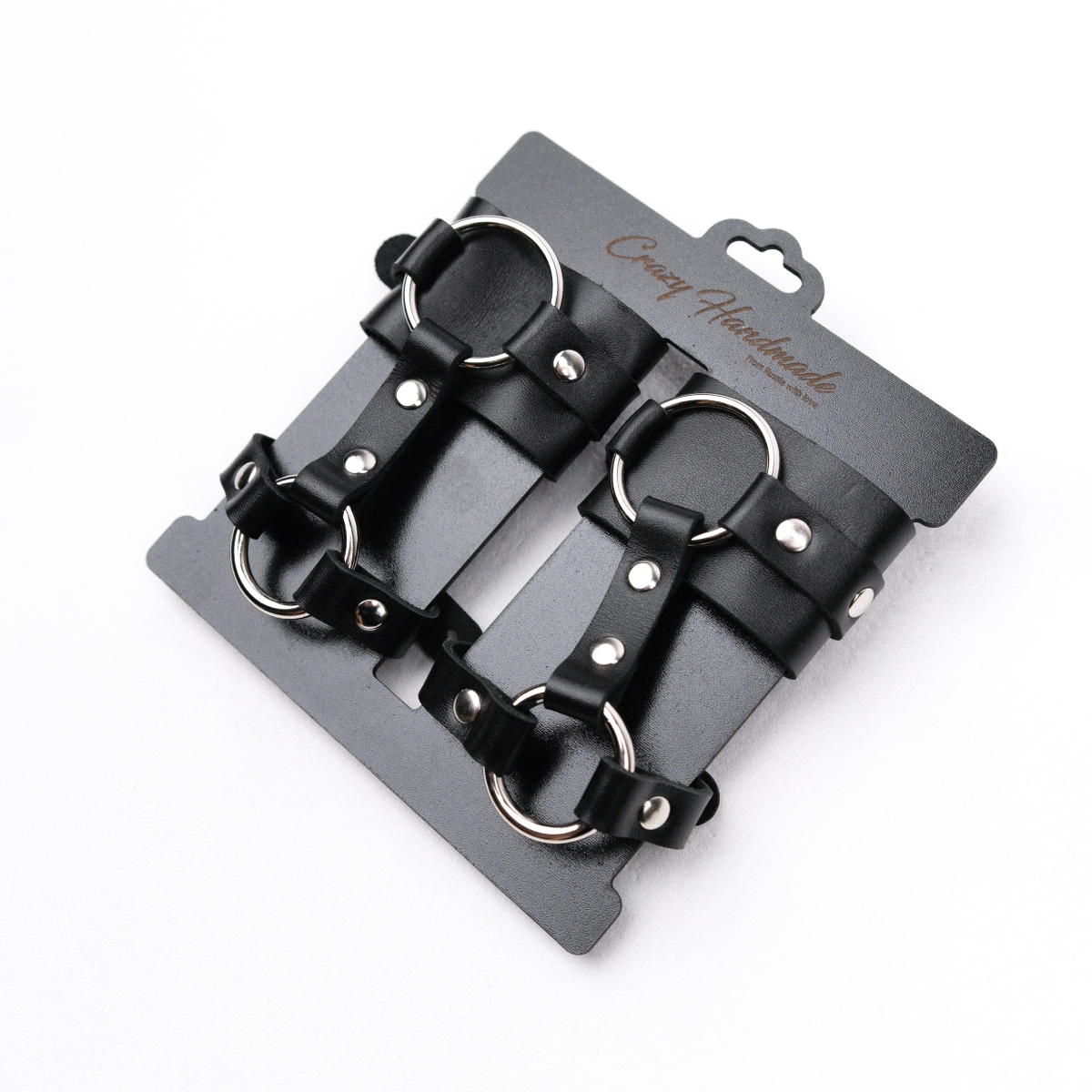 Наручники выполнены из натуральной кожи черного цвета. Декорированы заклепками и металлическими кольцам. Вся фурнитура металлическая.