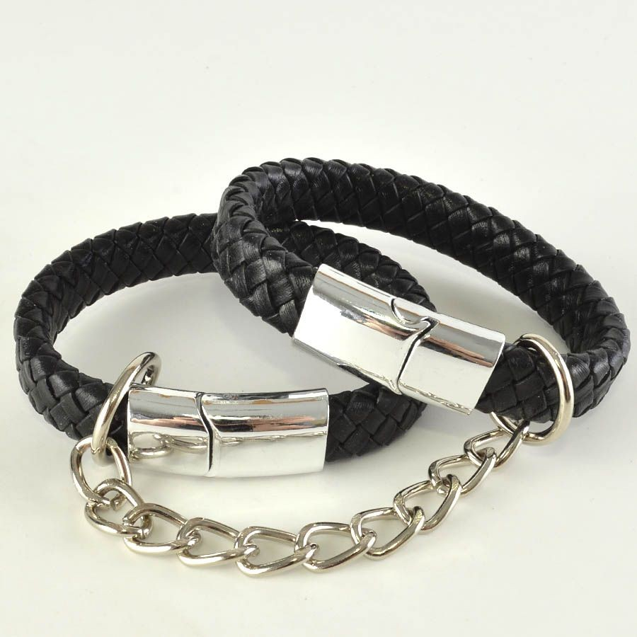 Манжеты состоят из плетеного винилового шнура шириной 1.1 см и магнитных застежек. Манжеты соединены между собой цепью. Если вы хотите чтобы у вас получился ошейник или чокер, то вы можете соединить между собой манжеты на застежки. Длина манжет 18 см