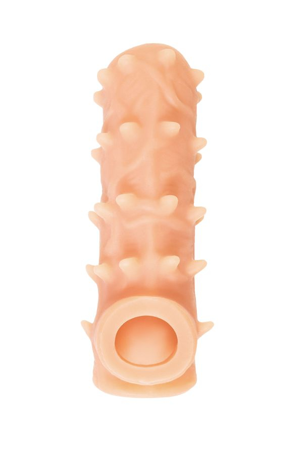 Ярко выраженный рельеф в виде многочисленных мягких шипов по всему стволу насадки стимулирует зону G, вход во влагалище и настойчиво ласкает чувствительные зоны. Дополнительный объем дарит то самое чувство наполненности и силу давления на стенки влагалища. Мужчина тоже будет ощущать стимуляцию за счет давления стенок влагалища на пенис.