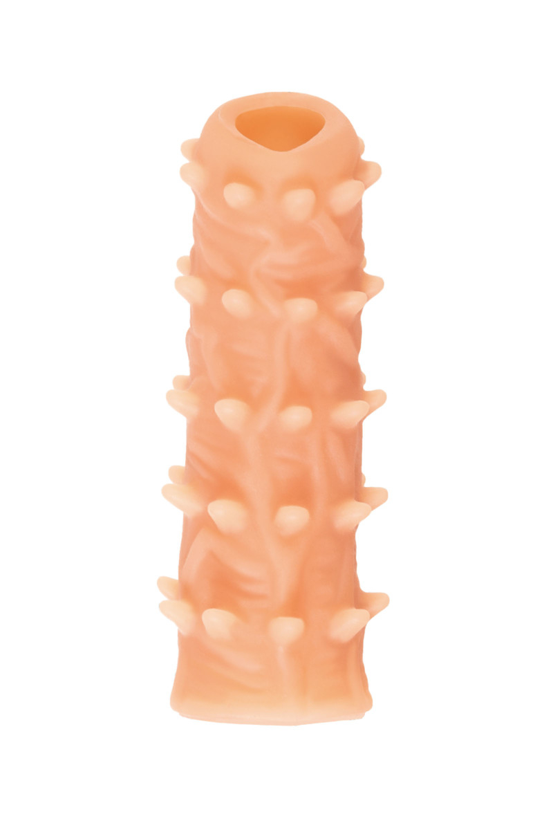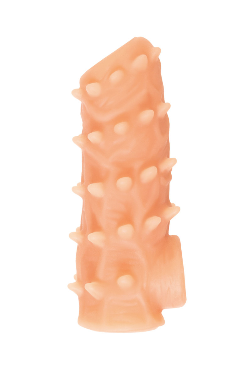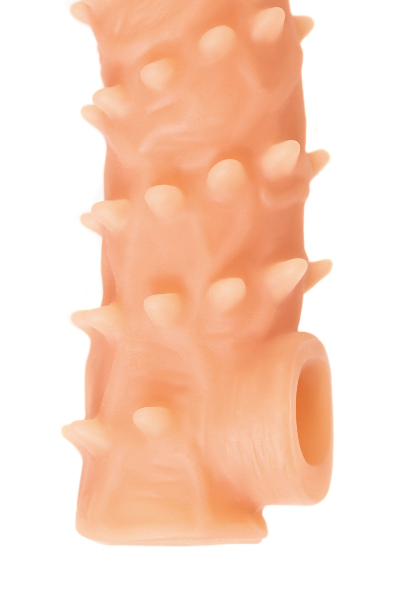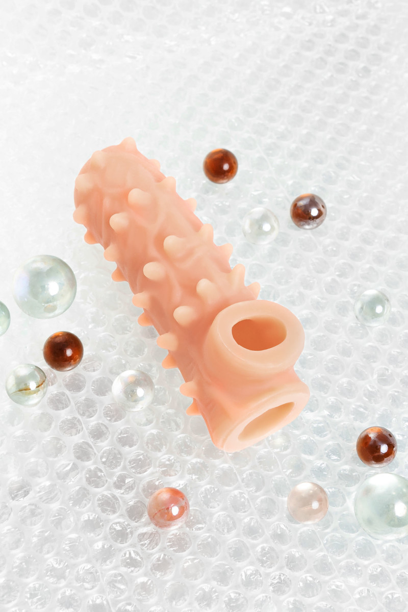 Ярко выраженный рельеф в виде многочисленных мягких шипов по всему стволу насадки стимулирует зону G, вход во влагалище и настойчиво ласкает чувствительные зоны. Дополнительный объем дарит то самое чувство наполненности и силу давления на стенки влагалища. Мужчина тоже будет ощущать стимуляцию за счет давления стенок влагалища на пенис.