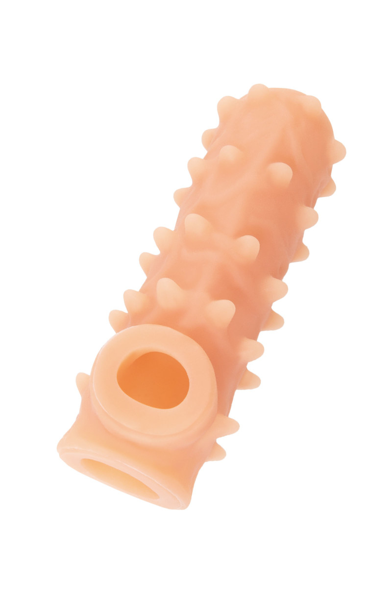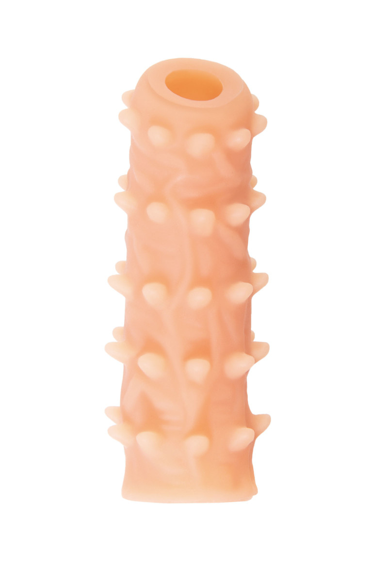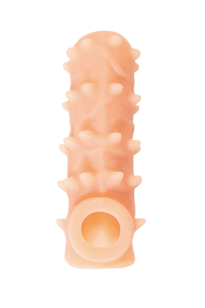 Насадка имеет форму- рукав, плотно прилегает к пенису, создавая дополнительную толщину и оставляя головку открытой. Это позволяет сохранить чувствительность головки, задерживая эякуляцию. В основании есть отверстие для мошонки, с помощью которого вы надежно зафиксируете насадку на пенисе, не ограничиваясь в активных движениях. Насадка, за счет плотного облегания мошонки и головки, усиливает эрекцию и исключает оттока крови от члена.