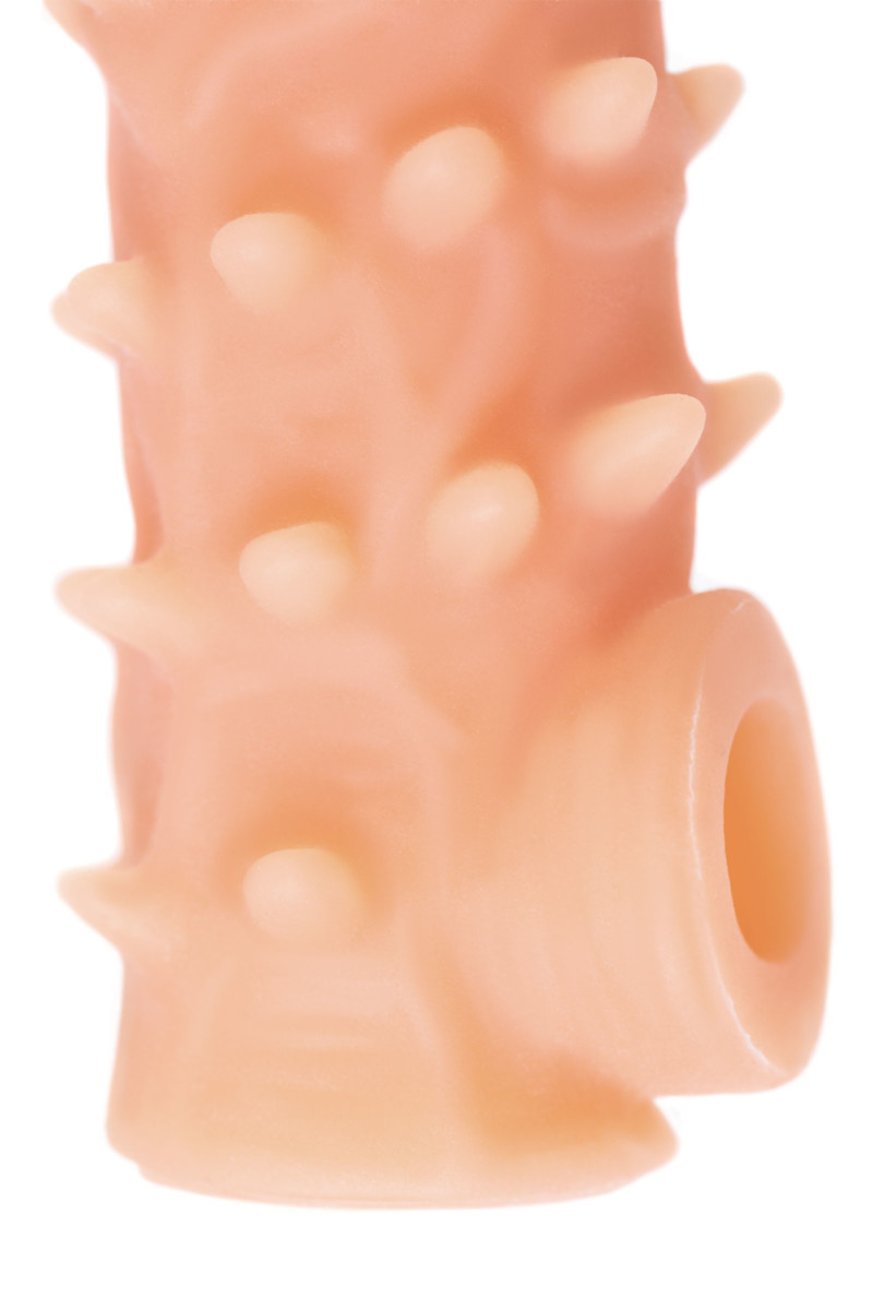 Ярко выраженный рельеф в виде многочисленных мягких шипов по всему стволу насадки стимулирует зону G, вход во влагалище и настойчиво ласкает чувствительные зоны. Дополнительный объем дарит то самое чувство наполненности и силу давления на стенки влагалища. Мужчина тоже будет ощущать стимуляцию за счет давления стенок влагалища на пенис.