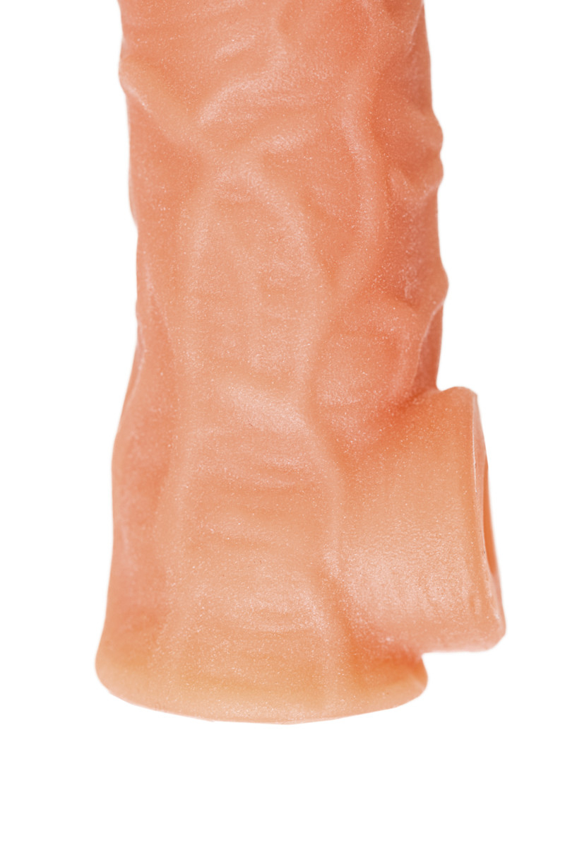 Насадка имеет форму- рукав, плотно прилегает к пенису, создавая дополнительную толщину и оставляя головку открытой. Это позволяет сохранить чувствительность головки, задерживая эякуляцию. В основании есть отверстие для мошонки, с помощью которого вы надежно зафиксируете насадку на пенисе, не ограничиваясь в активных движениях. Насадка, за счет плотного облегания мошонки и головки, усиливает эрекцию и исключает оттока крови от члена.