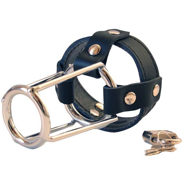 Пояс верности для мужчин из медицинской стали и кожи. Большое кольцо надевается на мошонку и закрывается с помощью металлического навесного замка. Кроме того, конструкция насадки позволяет прикрепить к ней цепь или поводок. Пояс верности не доставляет дискомфорта, но препятствует полноценной эрекции и половому акту в любых его проявлениях.