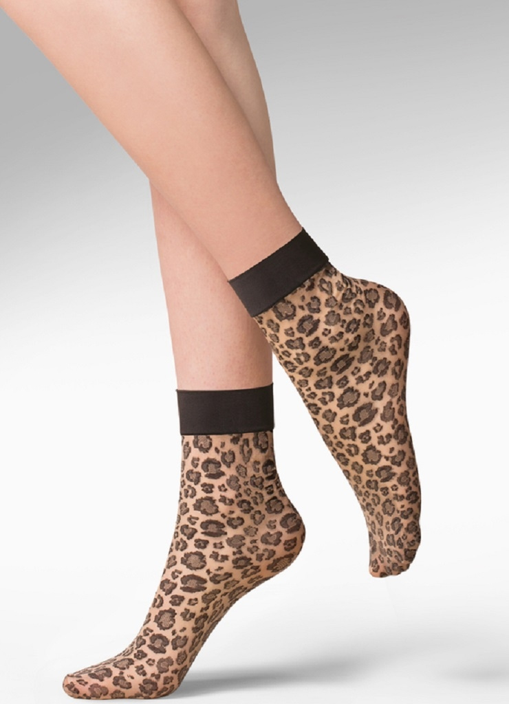 Женские носки с анималистичным принтом в виде пятен леопарда. Идеально повторяют контуры ноги. Широкая контрастная резинка черного цвета надежно фиксирует изделие на ноге, предотвращая сползание.