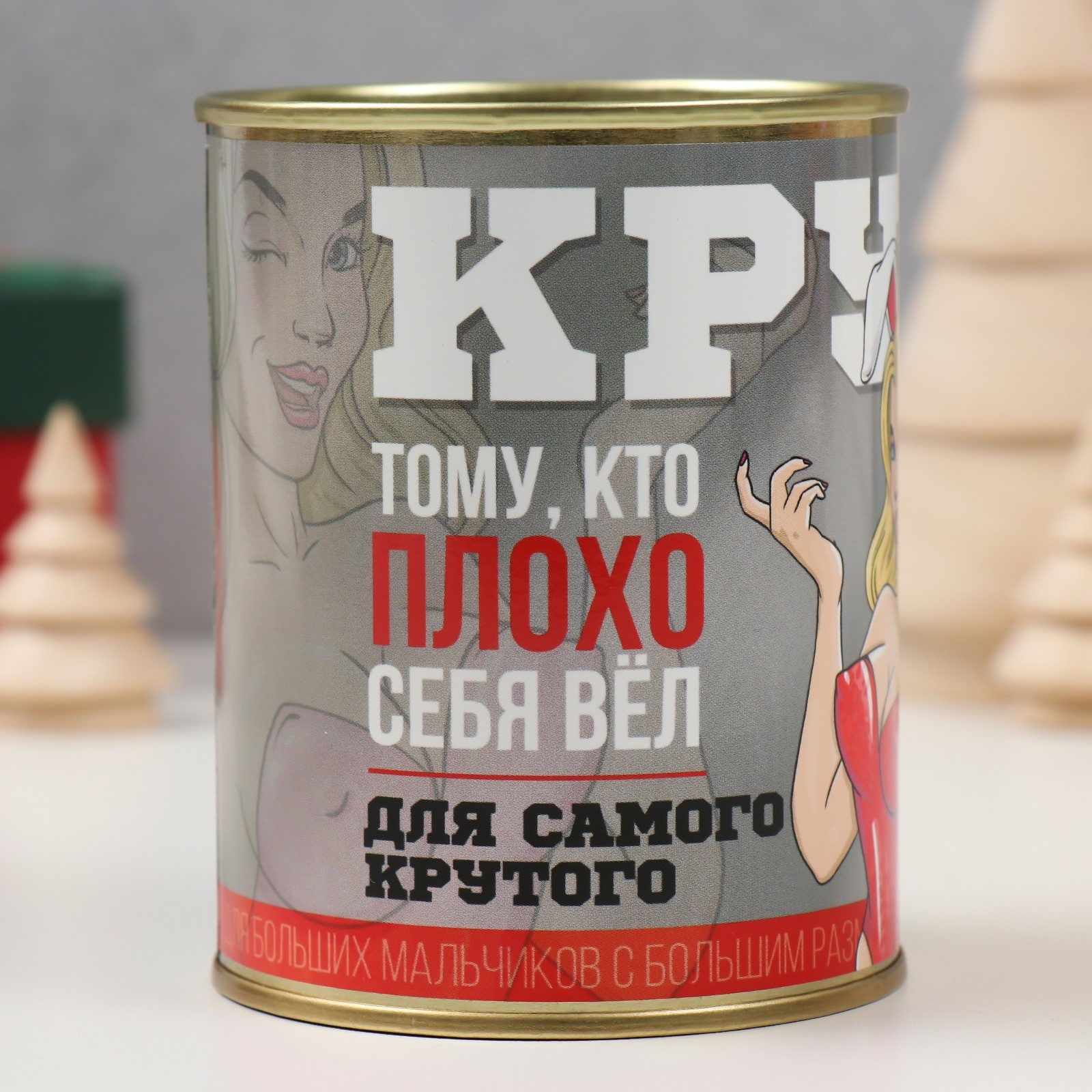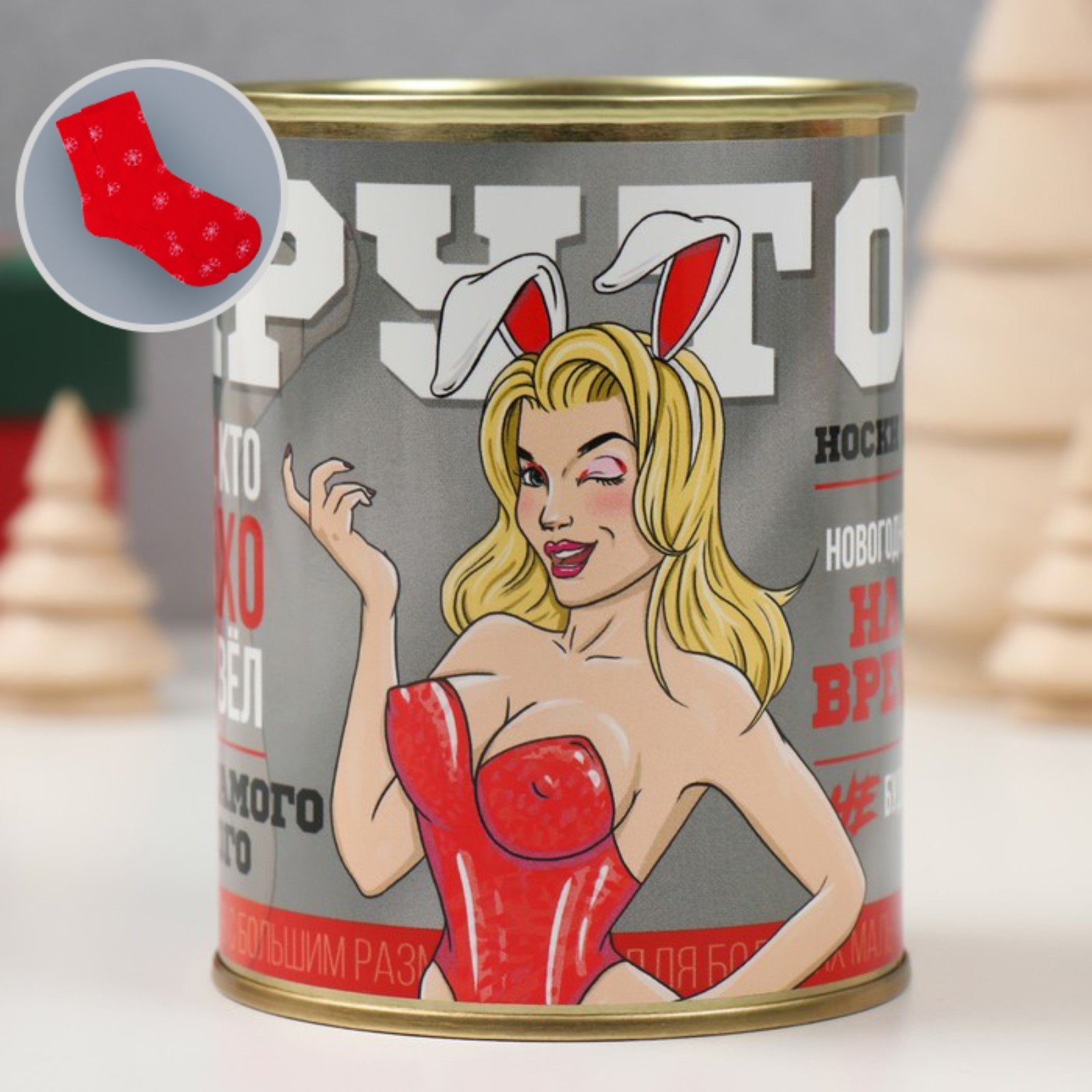 Носочки упакованы в жестяную банку со смешными жизненными надписями.