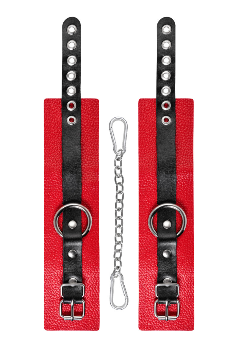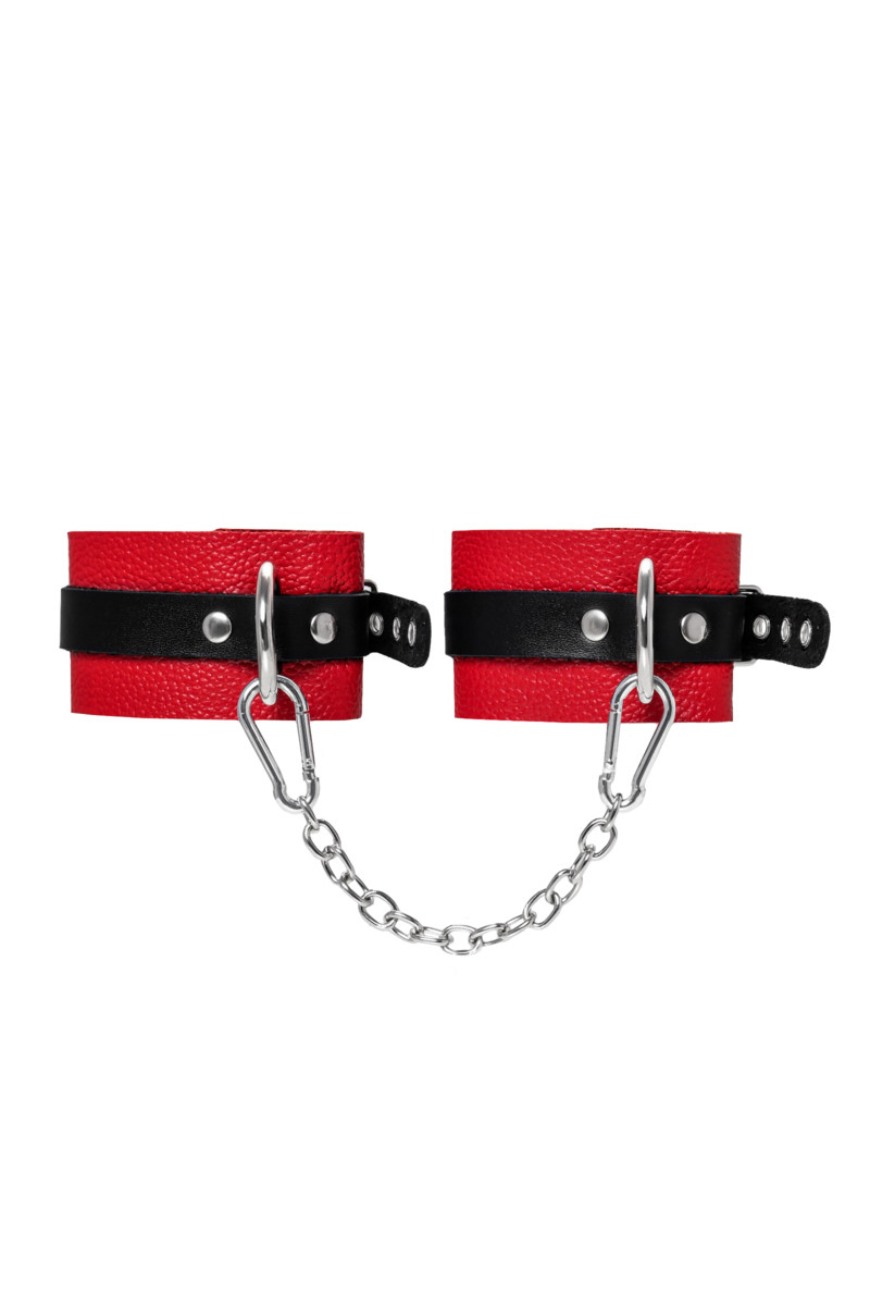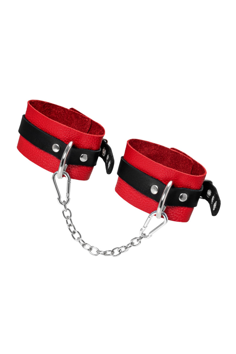 Оковы изготовлены полностью из красной, натуральной кожи. Ремешки выполнены из чёрной жёсткой кожи, украшены люверсами. Выделка материала произведена вручную. Ремешки и широкая манжета хорошо держат форму: не тянутся и не мнутся. Качественная металлическая фурнитура добавляет лоска изделию, а аромат натуральной кожи повышает градус возбуждения.